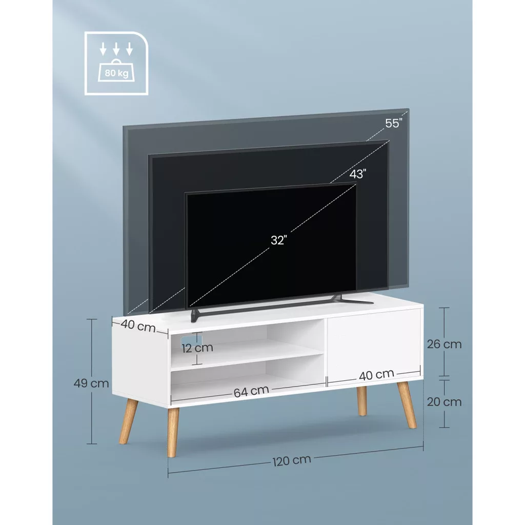 55 hüvelykes TV-khez: A 40 x 120 x 49 cm méretű TV-polc nyitott polcokkal akár 55 hüvelykes TV-ket is elbír. Harmonikusan illeszkedik különböző belső stílusokhoz